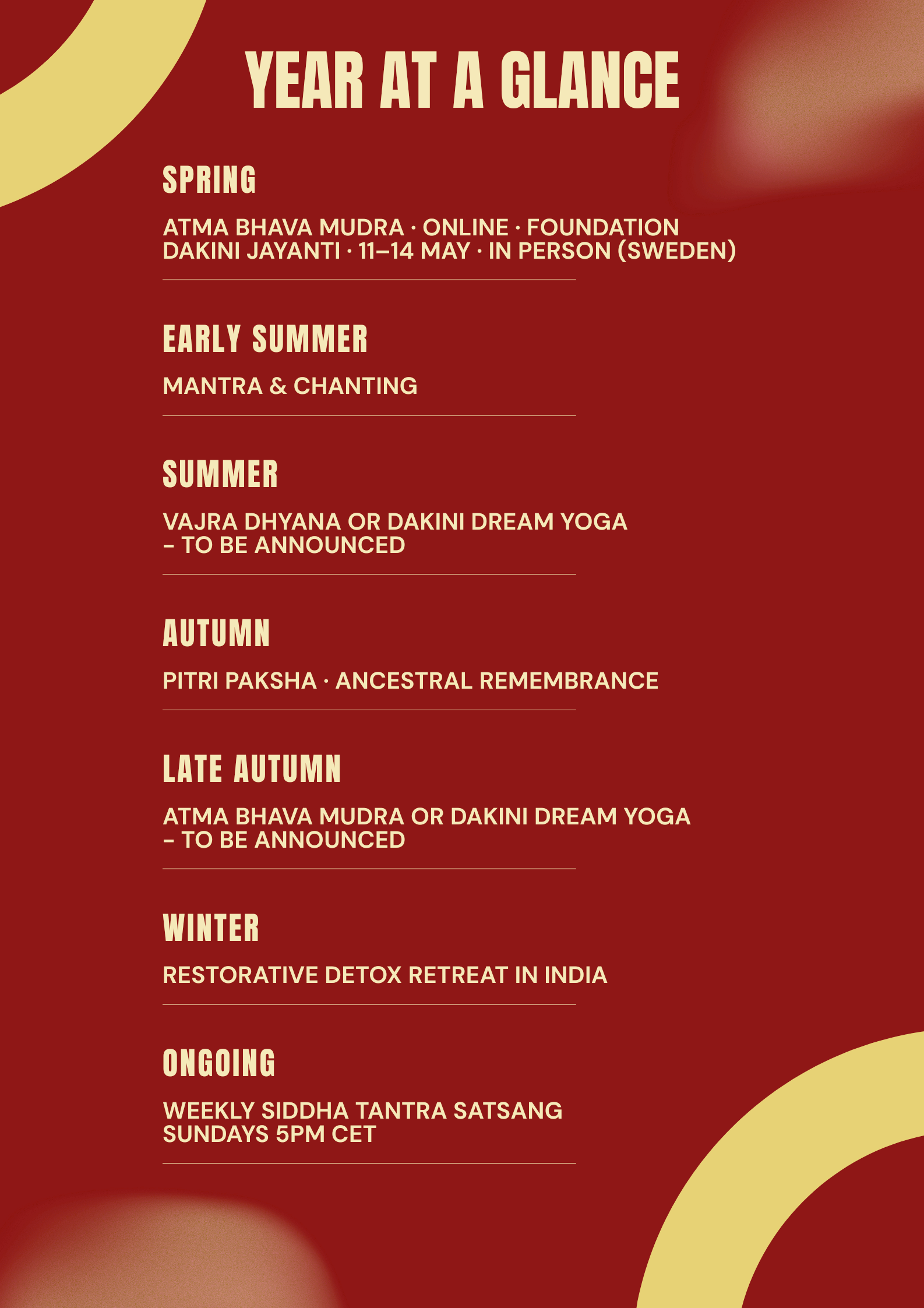 “Transcend tamas, embrace your whole self, and awaken Kula Kundalinī, the power of the Siddhas, through a journey of refinement, inner awakening and abiding awareness with Dakini & Vajra Yogini Tantra practices”